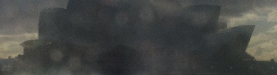 I’ve seen the Opera House as the backdrop to an opera (walking along dark paths overhung with trees, our way lit by fairy lights, the Botanic Gardens as I’ve never seen them before, I emerge into a clearing with an amphitheatre of seats, the set out in the cove and beyond, the Opera House, ready to dissolve into the background as Egypt is conjured on the stage and the fruit bats flap lazily overhead); I’ve sat in the opera hall for opera and the concert hall for concerts (these days we have the seats at the front, so close you can see the conductor’s baton and singers’ sweat – our approach is navigated, along the smooth path in the forecourt that becomes evident within the more gappy, bumpy pavers, up the lift then through the green room, where people uncostumed eat meat pies and chicken wraps); I’ve sat on those steps and watched concerts and ‘events’ (a car, smashed by a boulder; a bath filled with milk; Tim Minchin’s mad energy); I see it dissolving in rain or glistening with sun every time I take the ferry. Its sails tell me where I am on the harbour. It has, without me realising, become a part of my life.