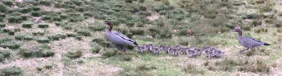 The most eagerly anticipated thing was the ice-cream, but the park held surprises. A fence had been built to protect a nesting plover. We inspected both fence and supercilious plover. Then over there – slowly slowly – quietly! – we crept close to watch two vigilant wood duck parents and ten tiny ducklings.