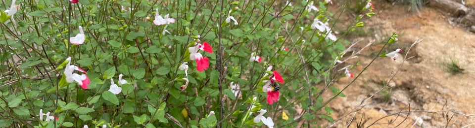 A year ago, after the bushfires, when everything that wasn’t burnt was scorched or looking like it had heat stroke, I planted a big pot of salvia for a quick burst of flowers for whatever insects had survived. It became a gathering point for native bees and honey bees alike, and every time I looked at it I felt I’d done something good. This summer it reflowered, and it continues to flower: an enormous coronet of ‘Hot Lips’ salvia with its circus flowers of pink and white; smaller, more compact, deep purple salvia beneath. Earlier this morning there was a dragonfly on its stalks, and just now two blue-banded bees (Amegilla cingulata), with their familiar buzz, careering around, dipping in and out. One is carrying a big yellow bundle of pollen on one of its back legs.